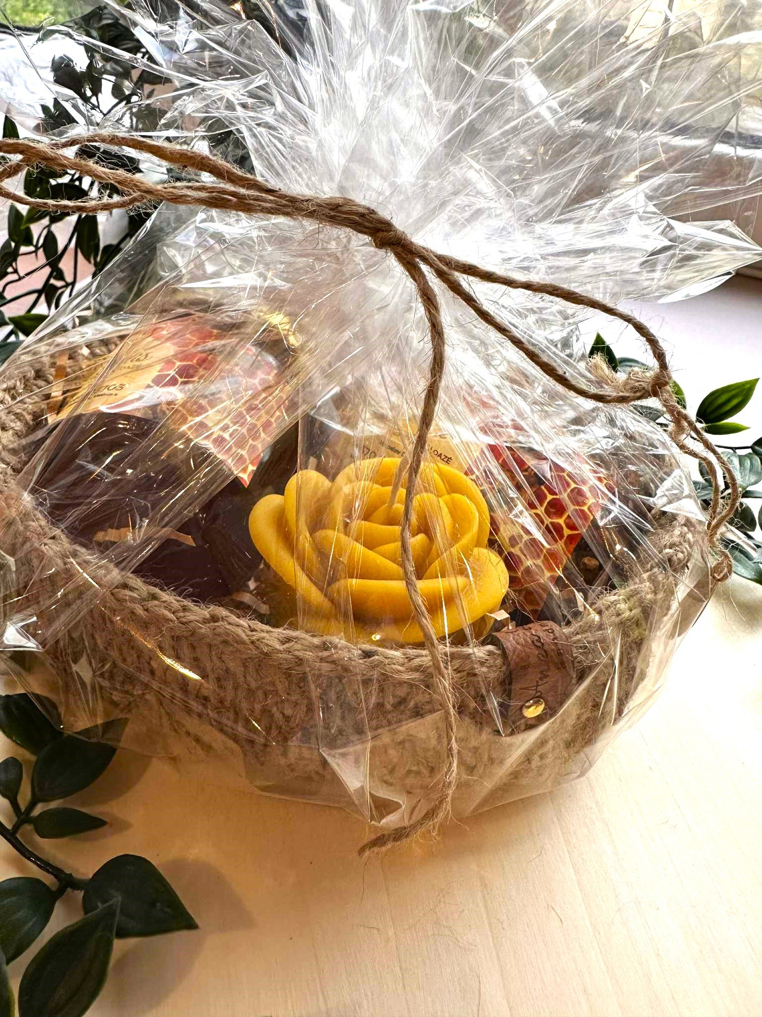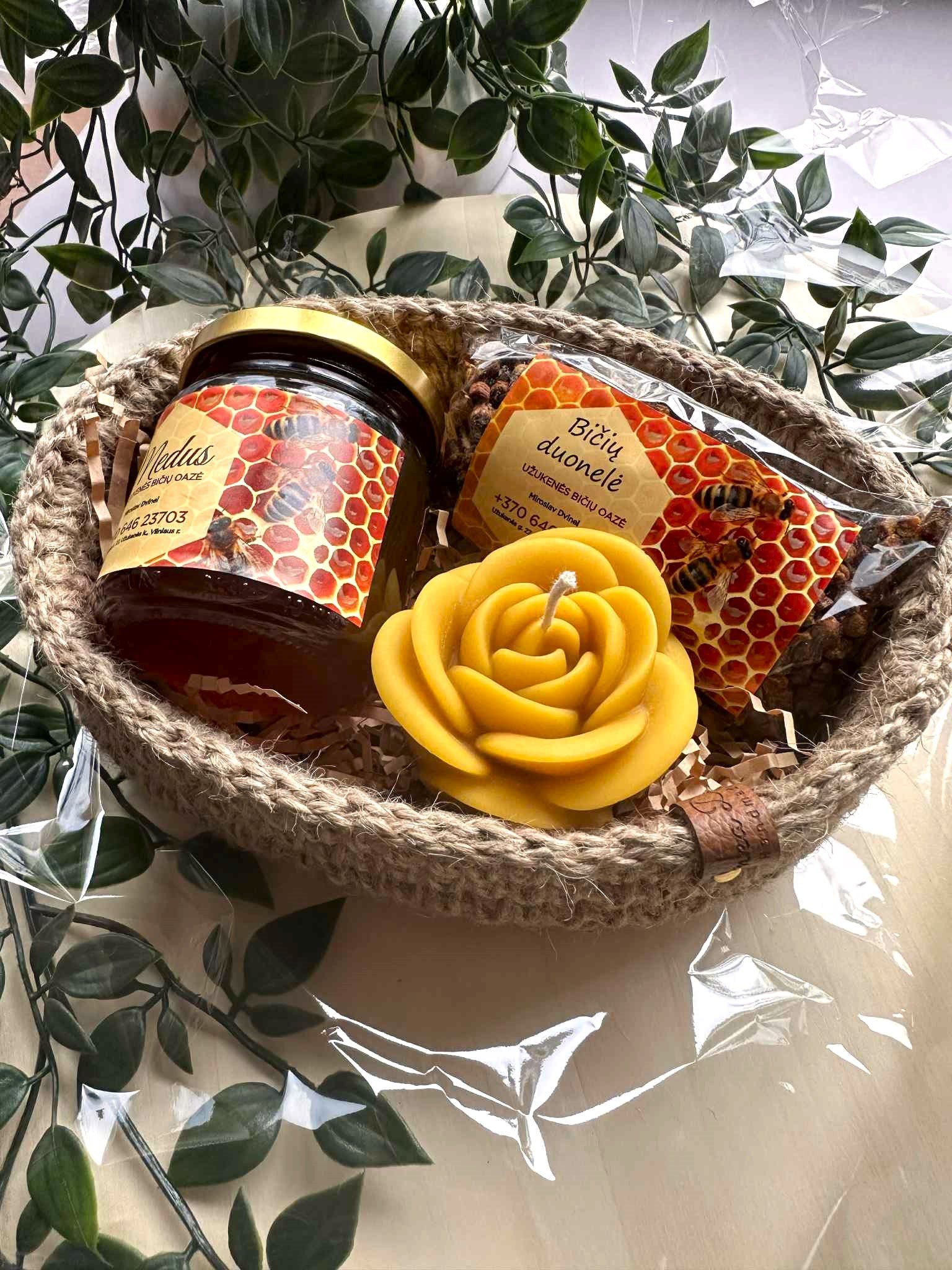 Kiekviename rinkinyje rasite tikrus bičių darbo stebuklus: medų, bičių duonelę, rankų darbo žvakę iš natūralaus vaško. Viskas supakuota dailiai – pasirinktinai į dekoratyvią dėžutę su langeliu arba į rankų darbo nertą krepšelį iš džiuto.