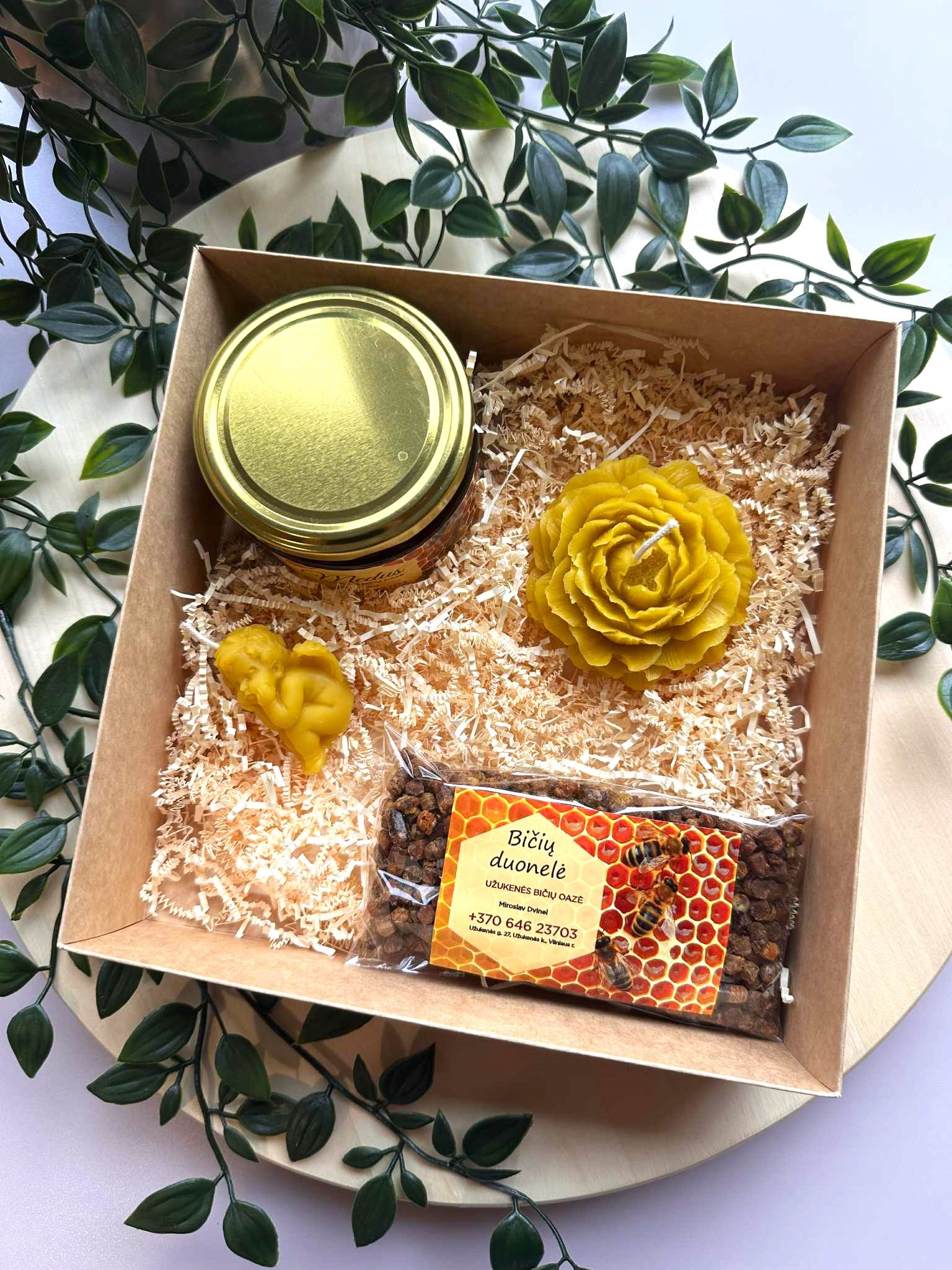 Dovanų rinkinys: medus, žvakė ir bičių duonelė