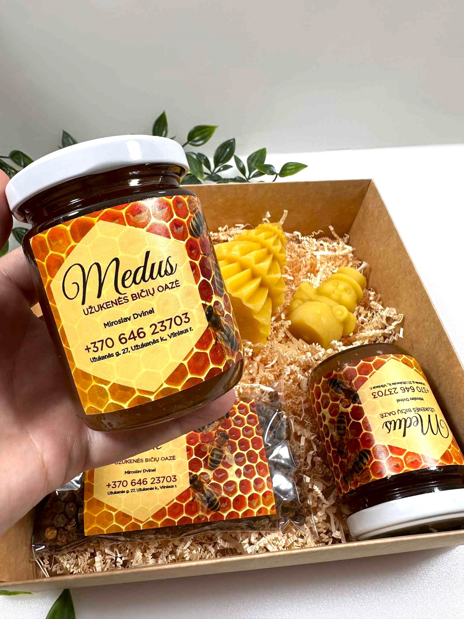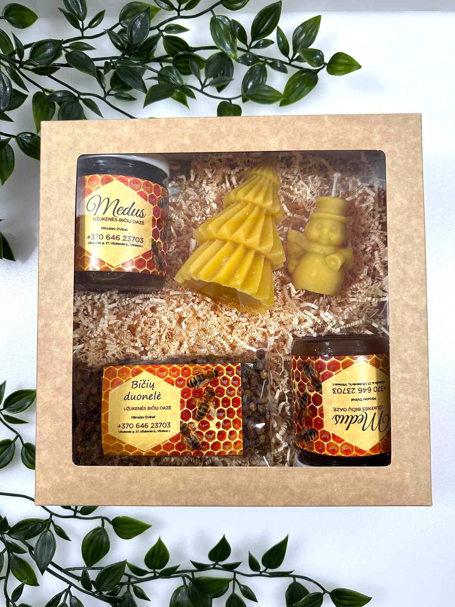 Kiekviename rinkinyje rasite tikrus bičių darbo stebuklus: medų, bičių duonelę, rankų darbo žvakę iš natūralaus vaško. Viskas supakuota dailiai – pasirinktinai į dekoratyvią dėžutę su langeliu arba į rankų darbo nertą krepšelį iš džiuto.
