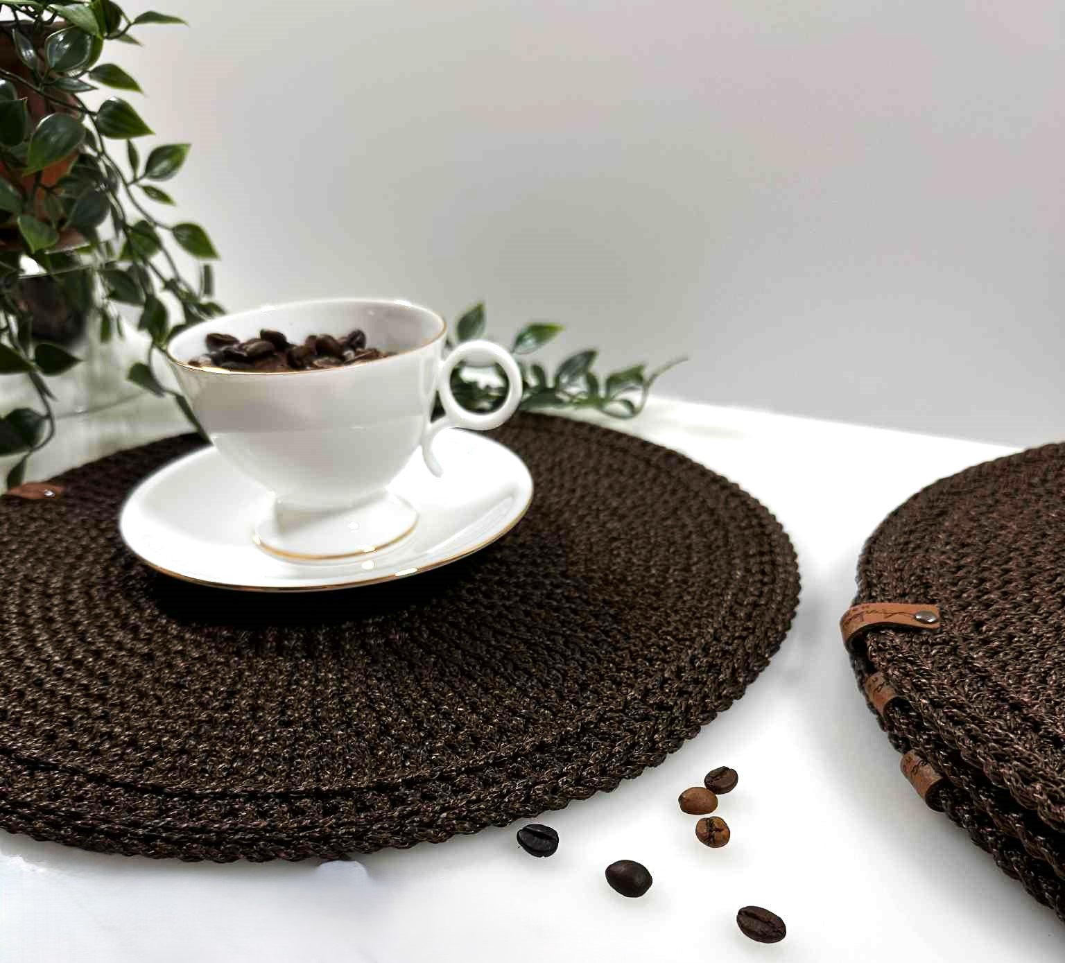 Stilingi, rankų darbo padėkliukai, nerti iš 3 mm poliesterio virvės. Tamsiai ruda spalva suteikia jaukumo ir elegancijos jūsų stalui. Patogu naudoti ir lengva prižiūrėti – galima skalbti skalbimo mašinoje 30 °C temperatūroje (be džiovinimo funkcijos).