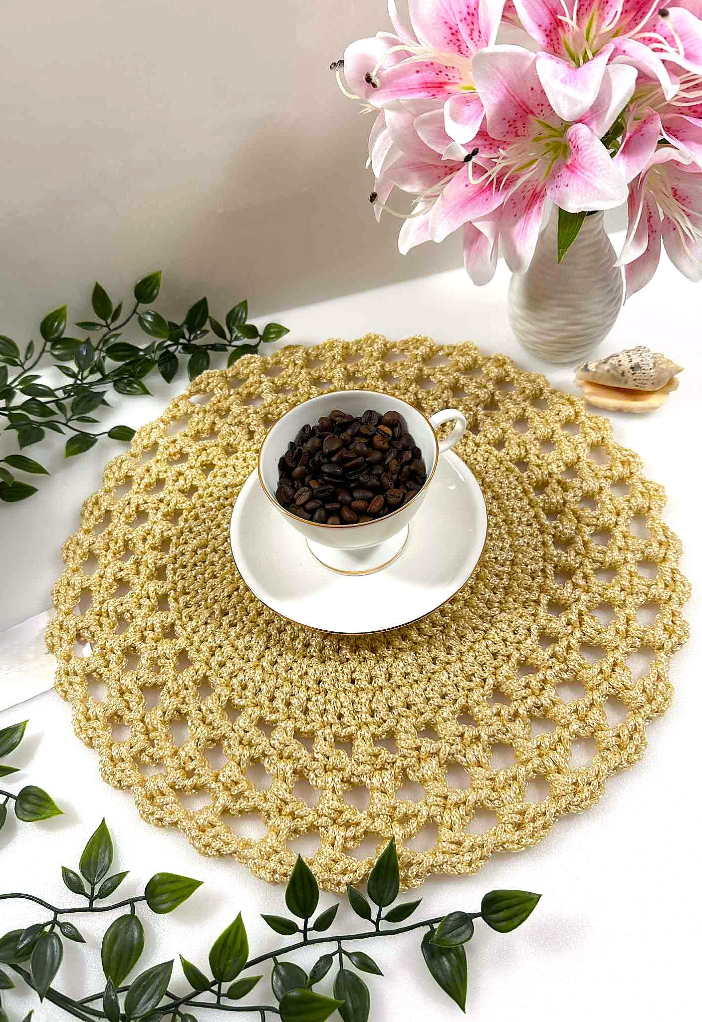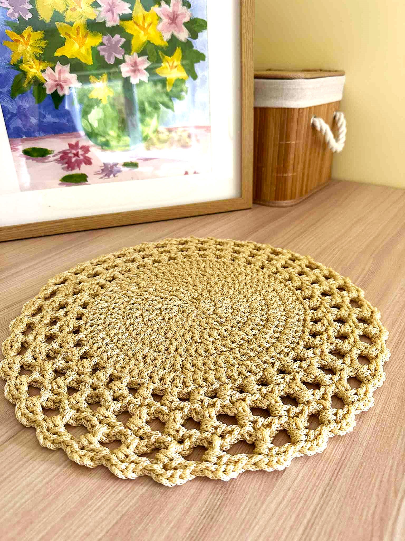 Stilingi, rankų darbo padėkliukai, nerti iš 3 mm poliesterio virvės. auksinė spalva suteikia jaukumo ir elegancijos jūsų stalui. Patogu naudoti ir lengva prižiūrėti – galima skalbti skalbimo mašinoje 30 °C temperatūroje (be džiovinimo funkcijos).