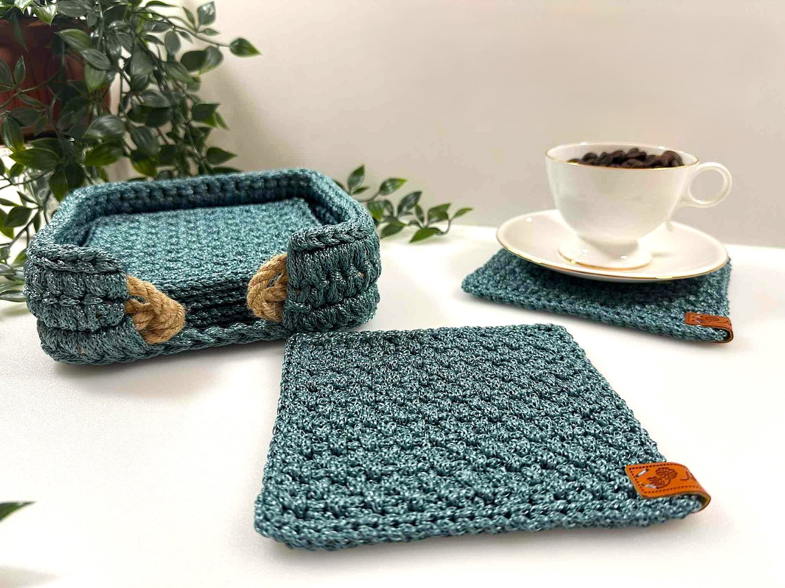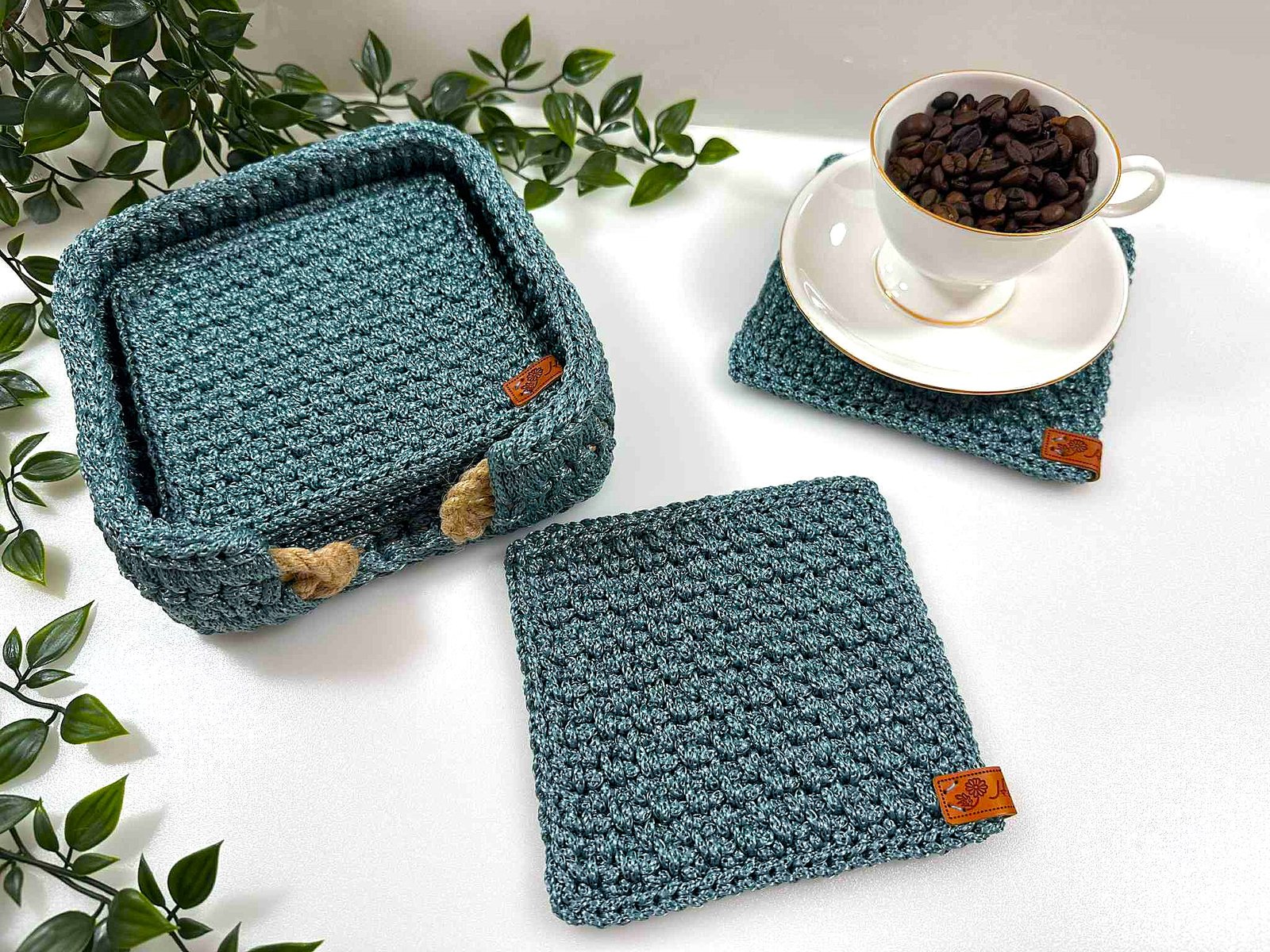 Stilingas rankų darbo komplektas, nertas iš 3 mm poliesterio virvės. Spalva – ypatinga tarp mėlynos ir žalios, suteikianti jaukumo bei originalumo.