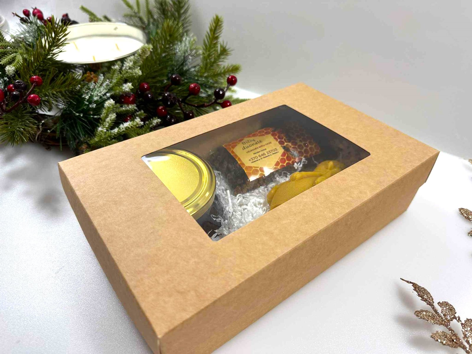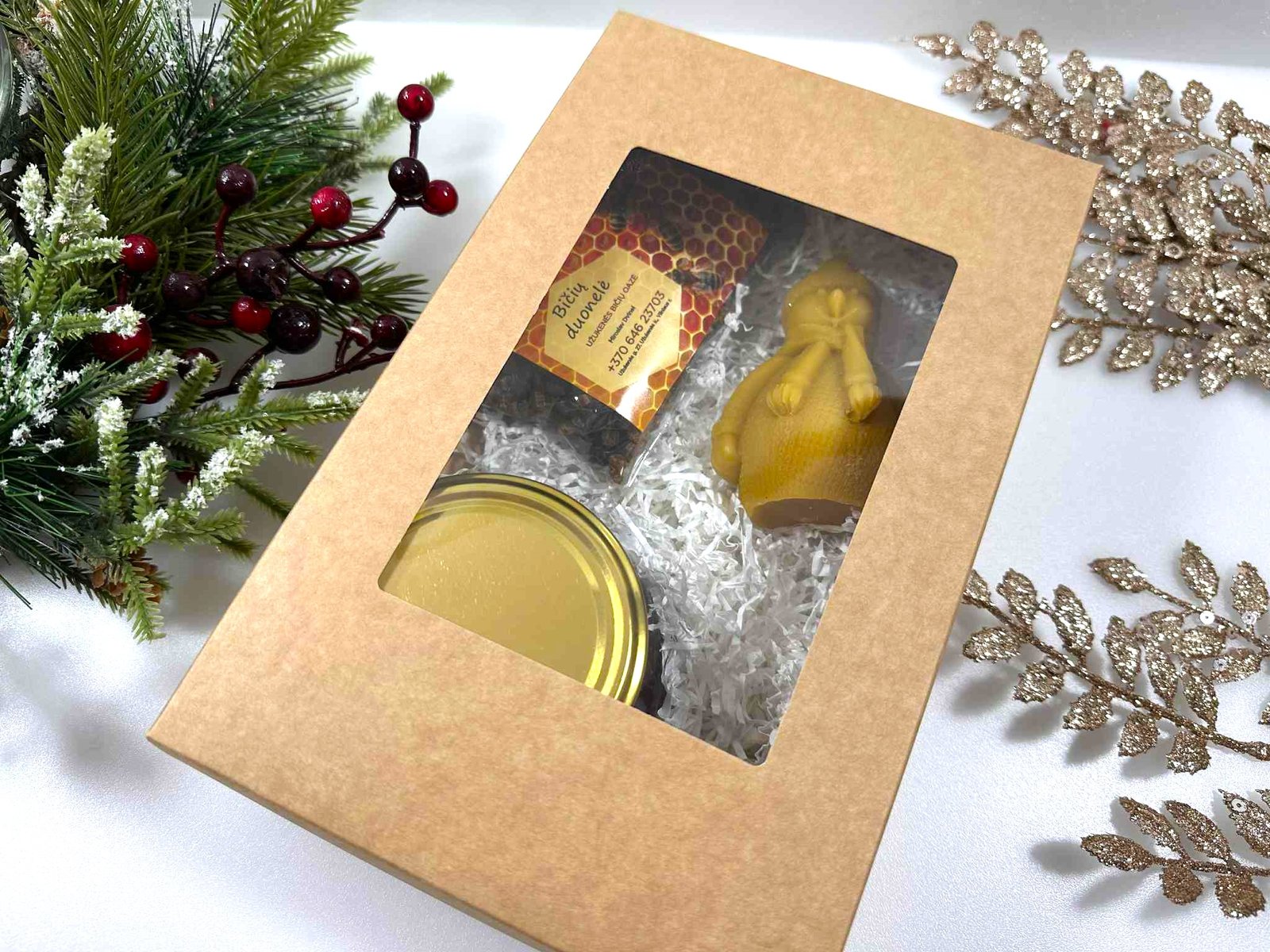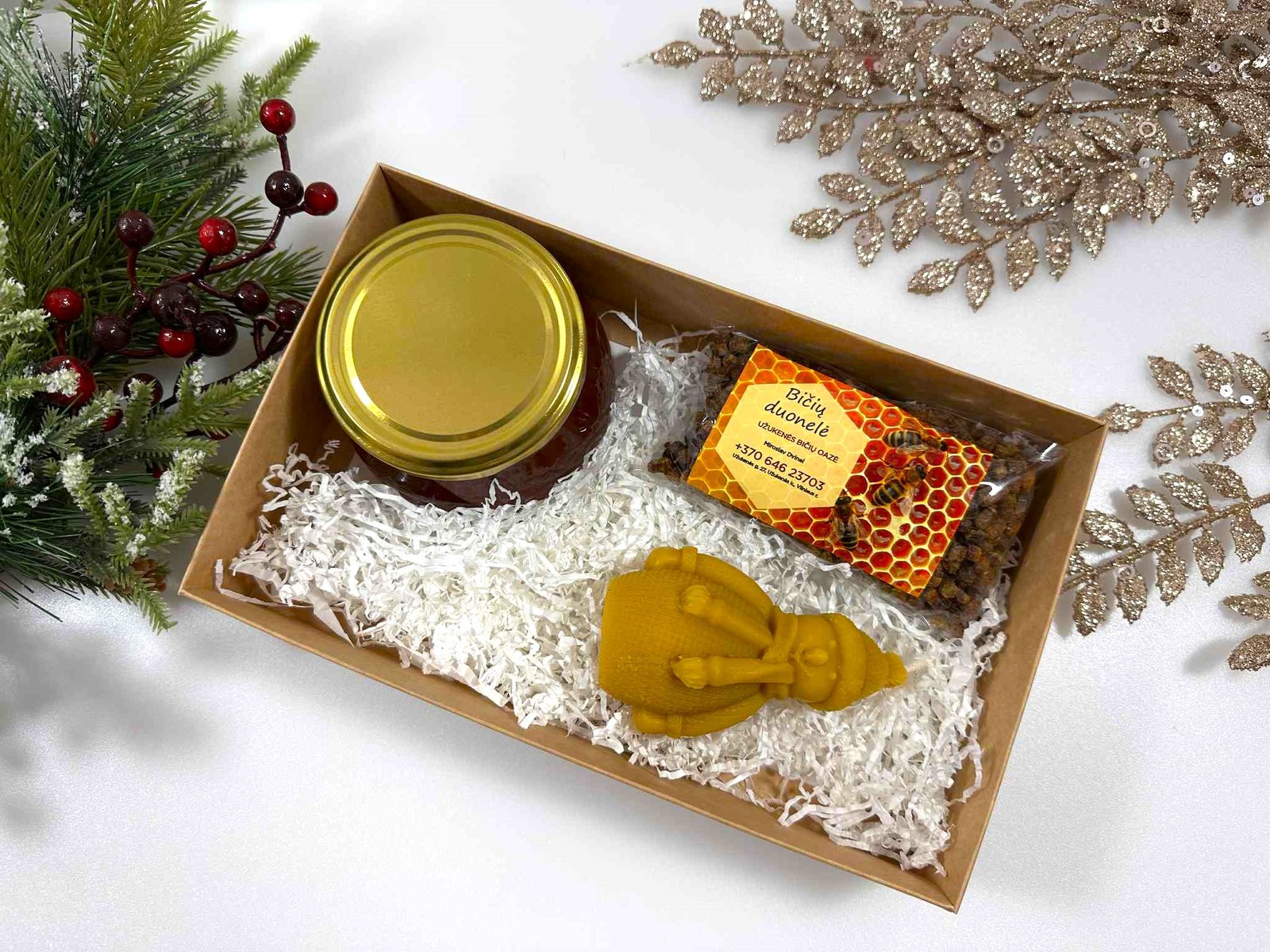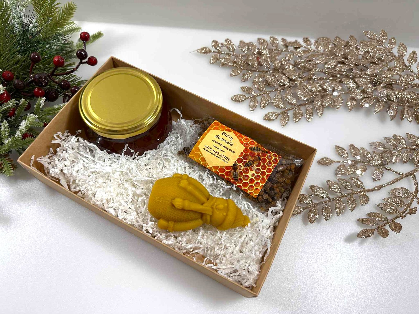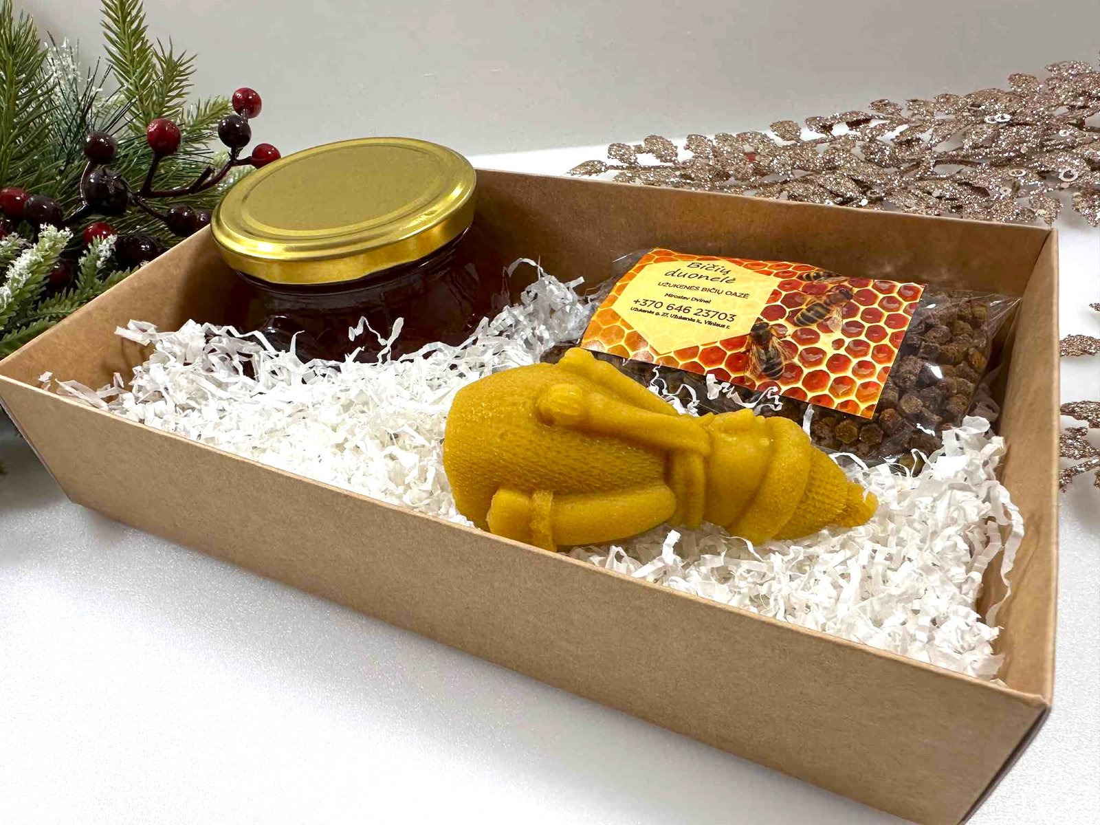 Kiekviename rinkinyje rasite tikrus bičių darbo stebuklus: medų, bičių duonelę, rankų darbo žvakę iš natūralaus vaško. Viskas supakuota dailiai – pasirinktinai į dekoratyvią dėžutę su langeliu arba į rankų darbo nertą krepšelį iš džiuto.