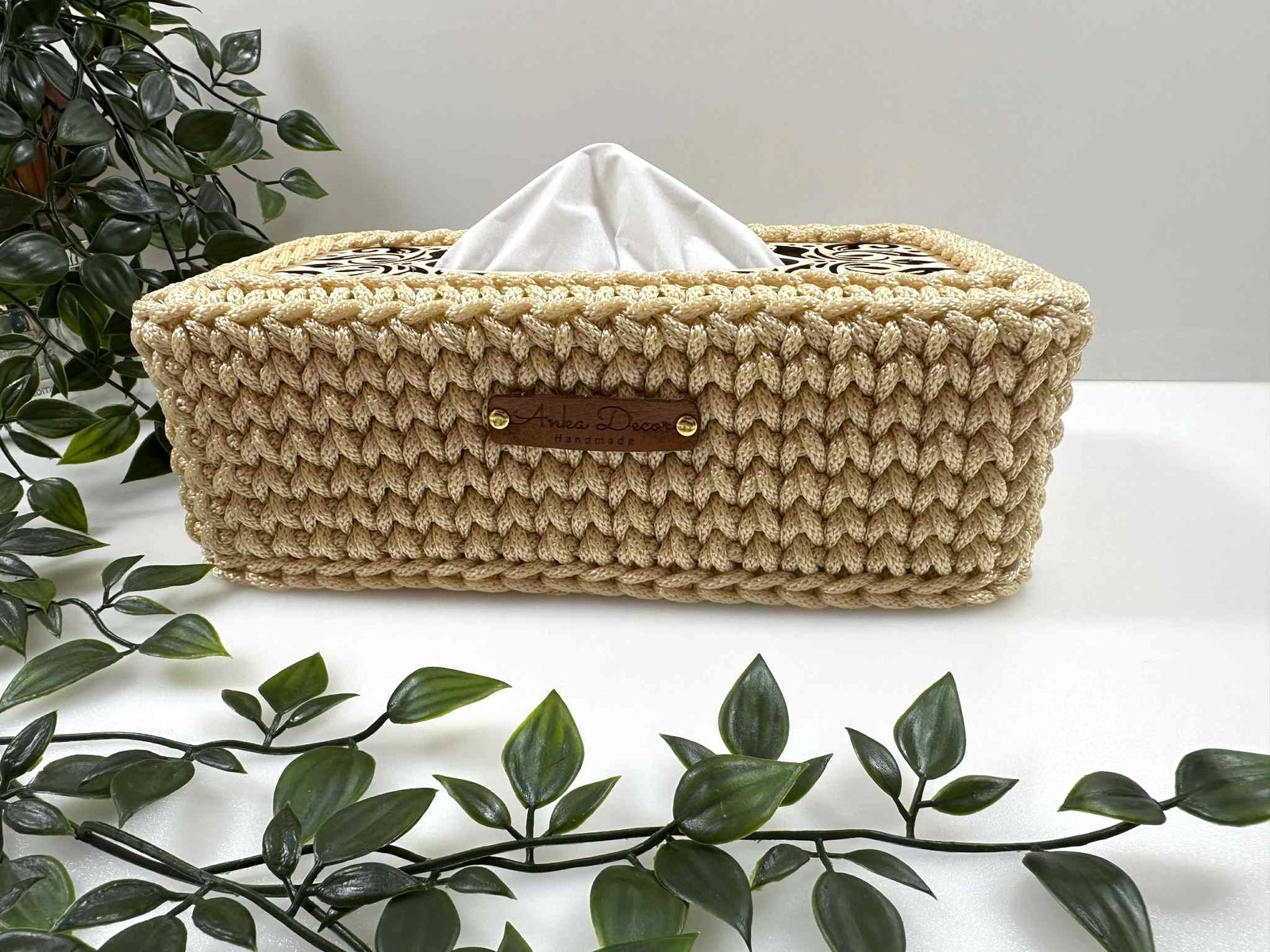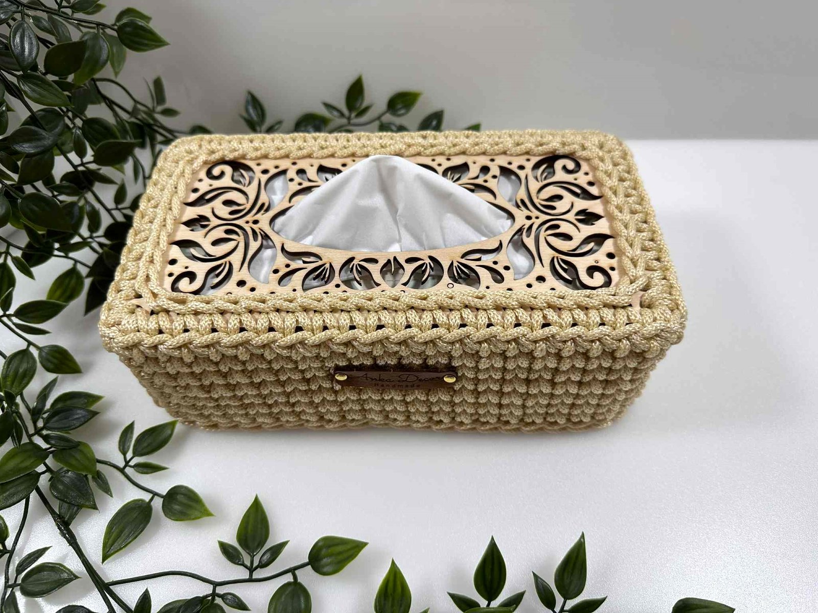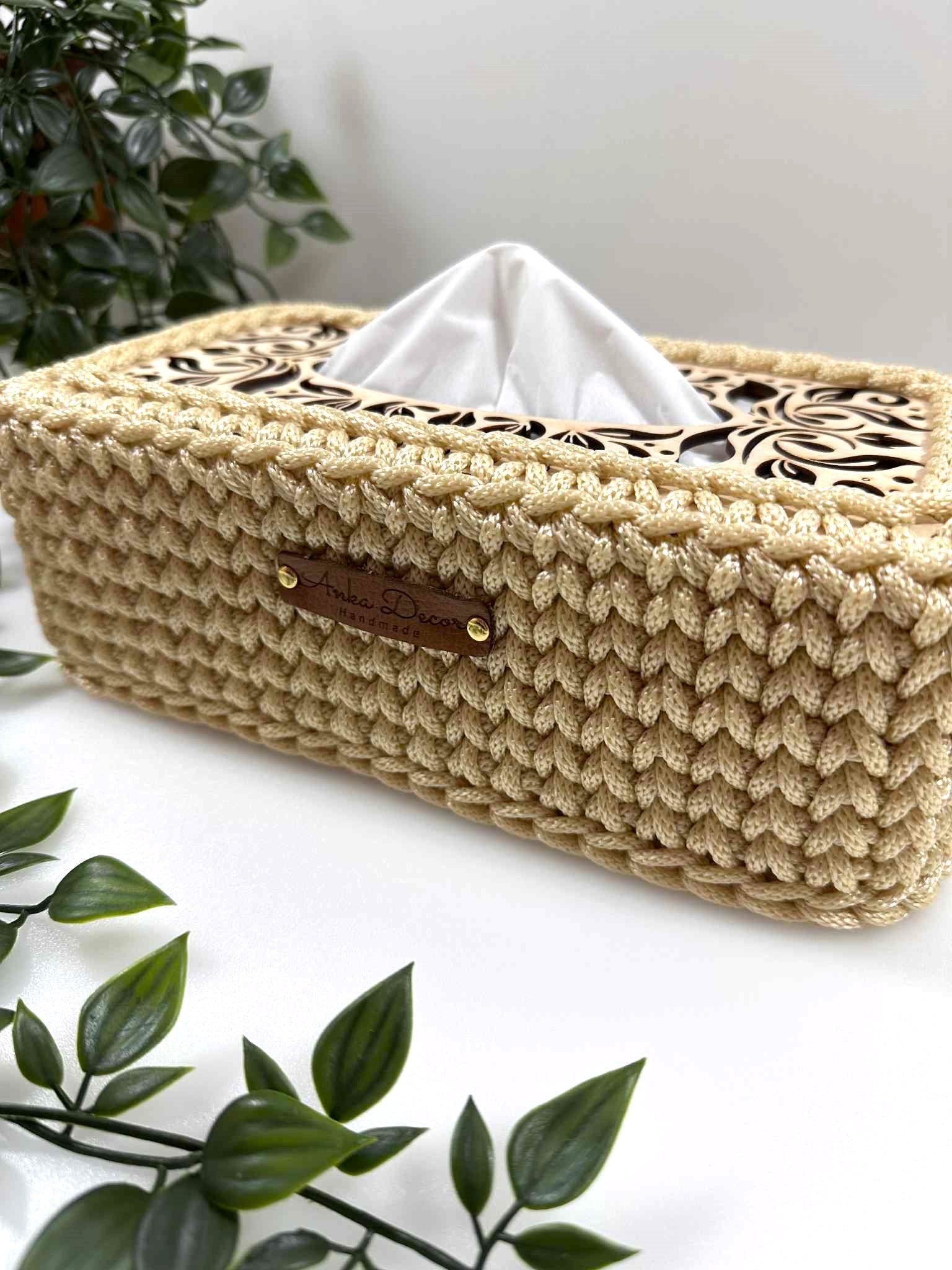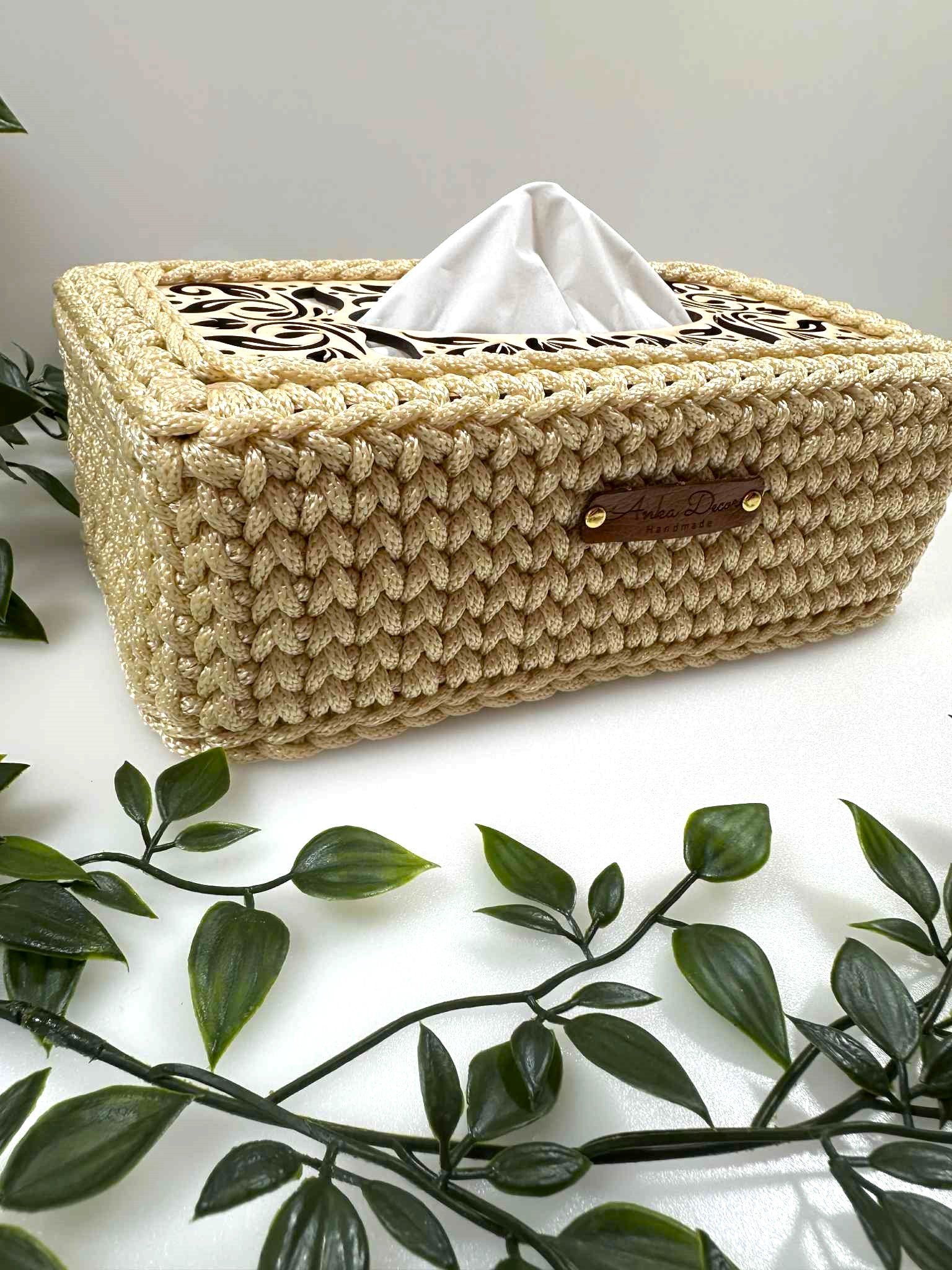 Rankų darbo servetėlių dėklas, nertas iš 5 mm virvelės. Viršus – dekoratyvi, graviruota medinė detalė.