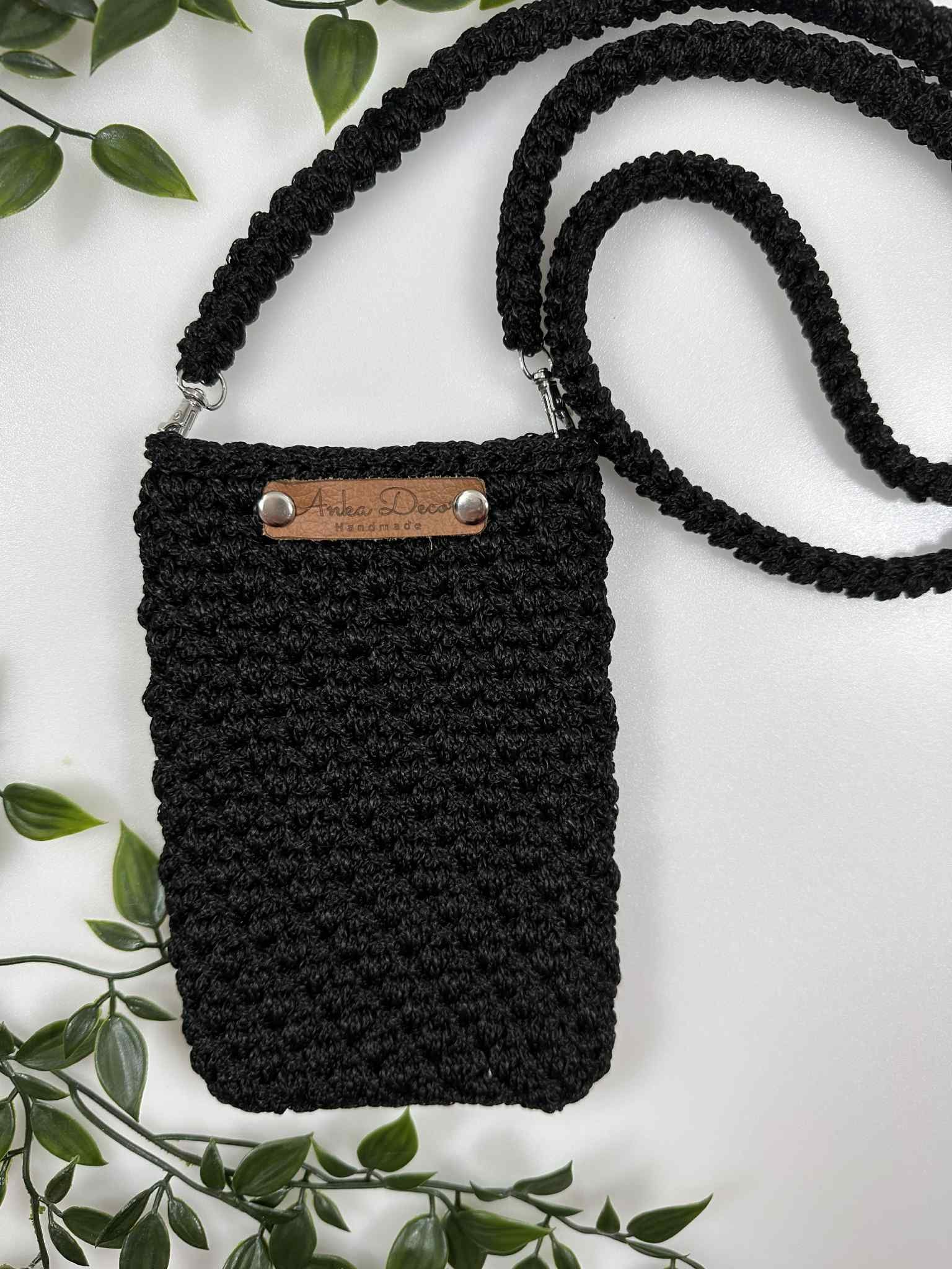 Rankų darbo nertas telefono dėklas iš 3 mm poliesterio virvės – juodos spalvos. Išmatavimai: 8×12×2 cm, rankenėlės ilgis – 110 cm.