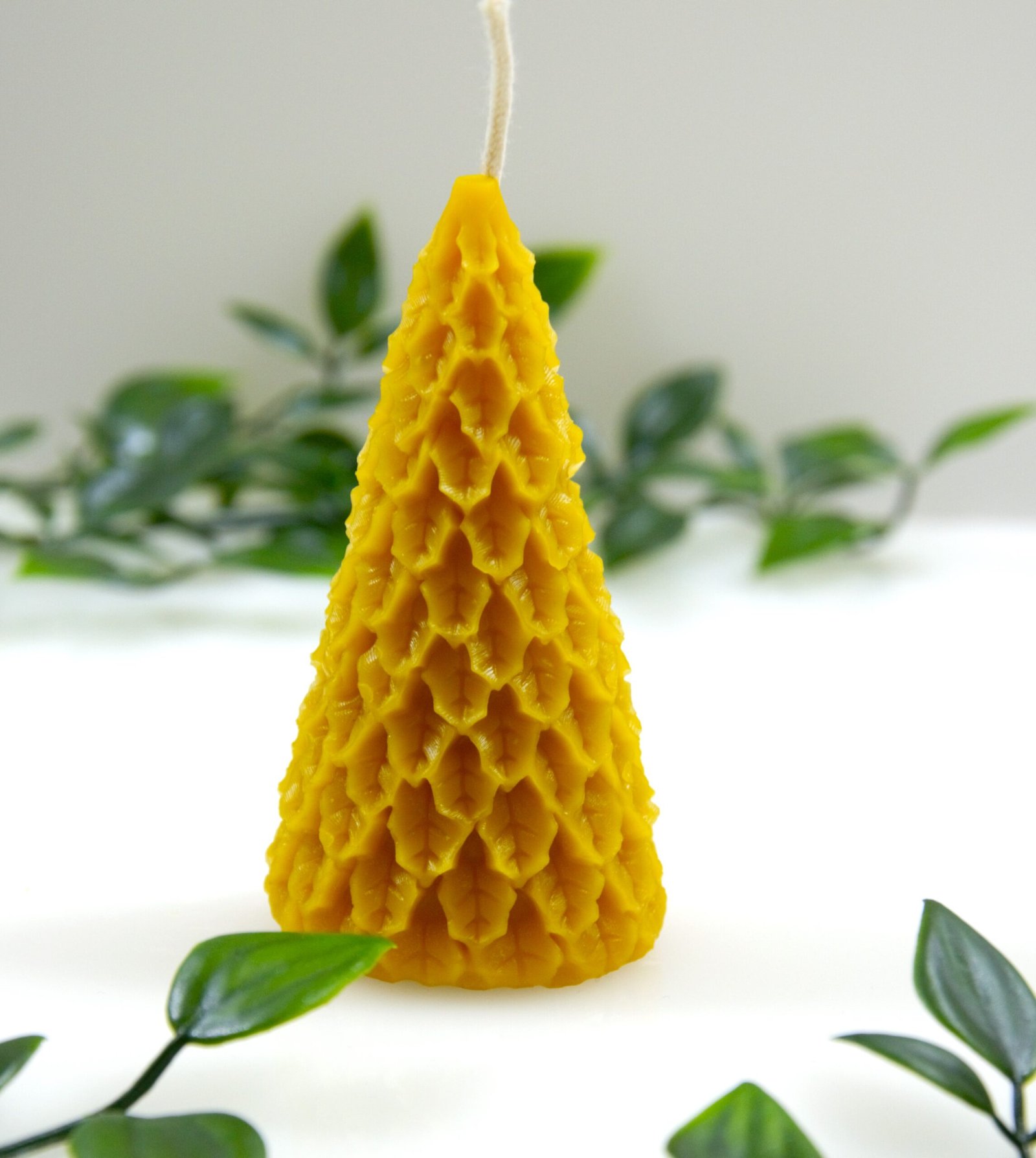 Bičių vaško žvakė – eglutė – amžinybės ir gyvybės simbolis. Aukštis 9 cm, plotis 4 cm. Sukuria jaukią kalėdinę nuotaiką.