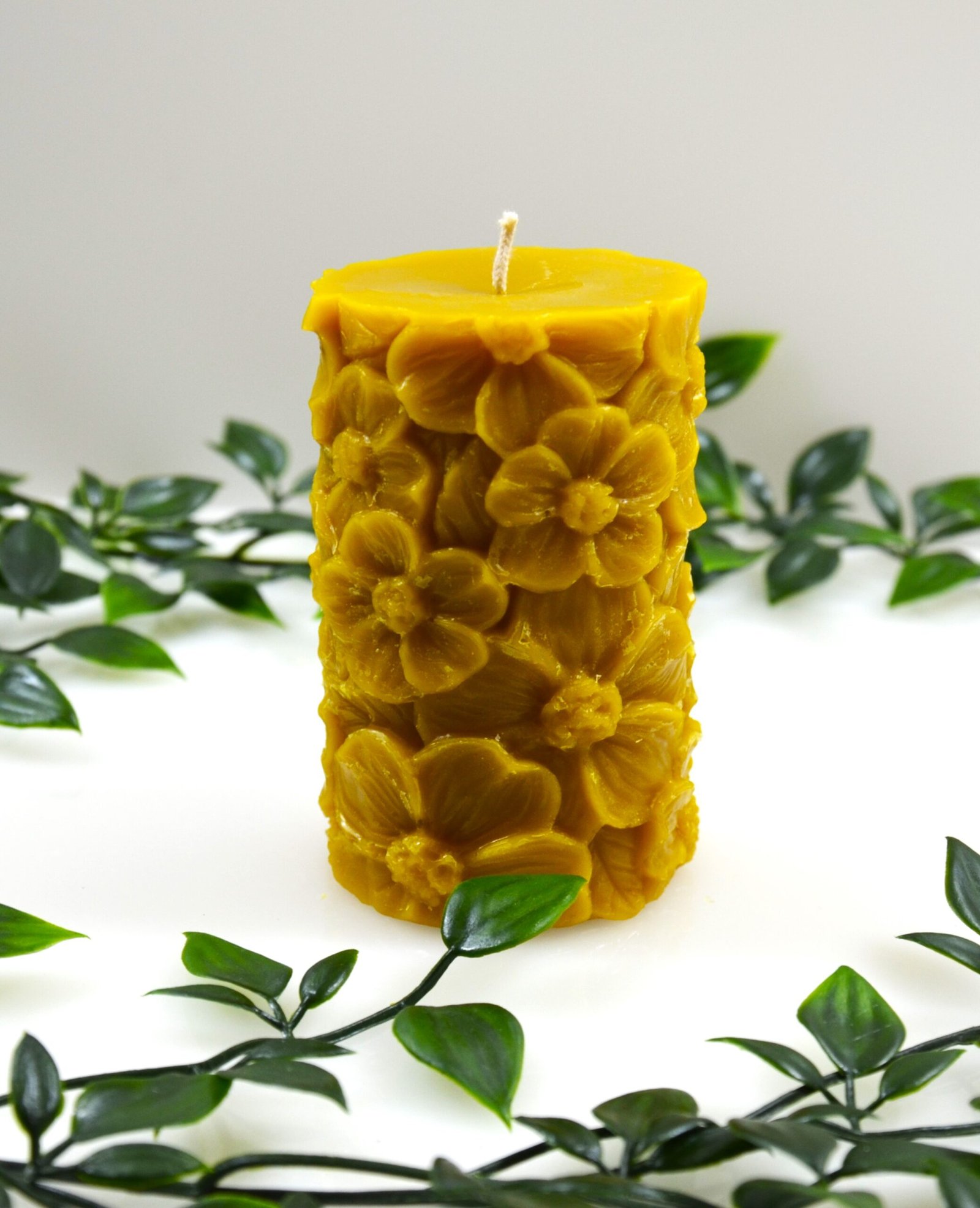 Bičių vaško žvakė – gėlių žydėjimas – gyvybės, grožio ir atsinaujinimo simbolis. Aukštis 10 cm, plotis 6 cm. Subtiliai papuoš namus ir suteiks jaukumo.